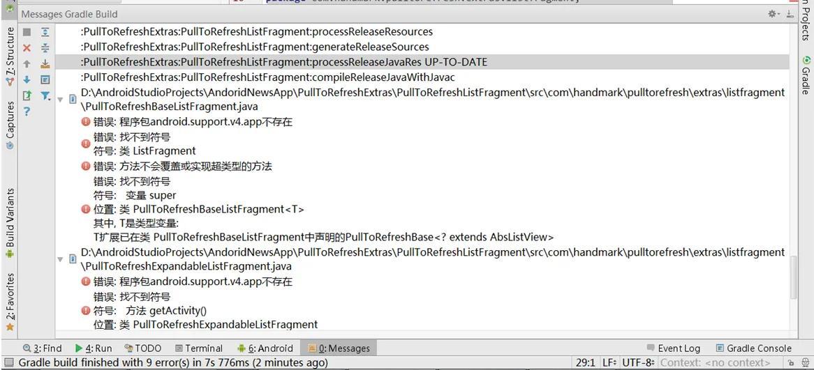 D:\AndroidStudioProjects\AndoridNewsApp\PullToRefreshExtras\PullToRefreshListFragment\src\com\handmark\pulltorefresh\extras\listfragment\PullToRefreshBaseListFragment.java Error:(19, 30) 错误: 程序包android.support.v4.app不存在 Error:(28, 106) 错误: 找不到符号 符号: 类 ListFragment Error:(32, 2) 错误: 方法不会覆盖或实现超类型的方法 Error:(34, 17) 错误: 找不到符号 符号: 变量 super 位置: 类 PullToRefreshBaseListFragment<T> 其中, T是类型变量: T扩展已在类 PullToRefreshBaseListFragment中声明的PullToRefreshBase<? extends AbsListView>
