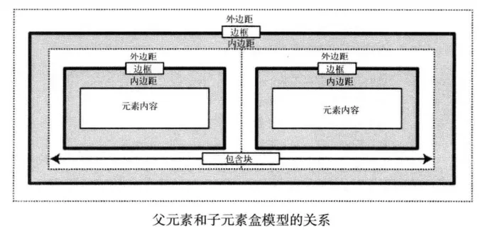 元素还可以包含其他元素。这种情况下,父元素的内容盒子称为子元素的块容器(container block),通常称为容器。这种关系如下图所示: