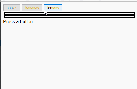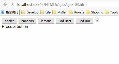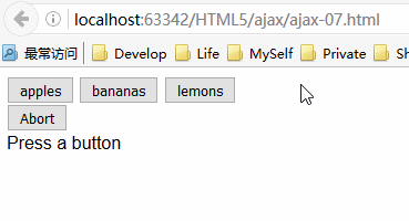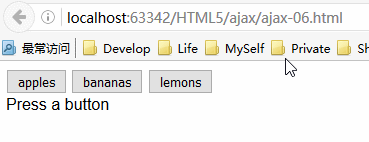 当某个按钮被按下后,示例中的脚本会载入另一个HTML文档,并让它称为div元素的内容。其他的文档一共三个,分别对应button元素上的说明标签:apples.html、lemons.html 和 bananas.html。