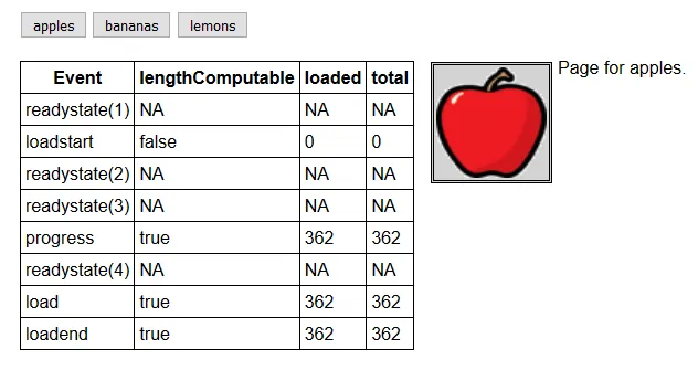<!DOCTYPE html> <html lang="en"> <head> <meta charset="UTF-8"> <title>使用XMLHttpRequest定义的一次性事件</title> <style> table {margin: 10px;border-collapse: collapse; float: left;} div{margin: 10px;} td,th{padding: 4px;} </style> </head> <body> <div> <button>apples</button> <button>bananas</button> <button>lemons</button> </div> <table id="events" border="1"></table> <div id="target"> Press a button </div> <script type="application/javascript"> var buttons = document.getElementsByTagName("button"); for(var i=0; i<buttons.length; i++){ buttons[i].onclick = handleButtonPress; } var httpRequest; function handleButtonPress(e){ clearEventDetails(); httpRequest = new XMLHttpRequest(); httpRequest.onreadystatechange = handleResponse; httpRequest.onerror = handleError; httpRequest.onload = handleLoad;; httpRequest.onloadend = handleLoadEnd; httpRequest.onloadstart = handleLoadStart;; httpRequest.onprogress = handleProgress; httpRequest.open("GET", e.target.innerHTML+".html"); httpRequest.send(); } function handleResponse(e){ displayEventDetails("readystate("+httpRequest.readyState+")") if(e.target.readyState == XMLHttpRequest.DONE && e.target.status == 200){ document.getElementById("target").innerHTML = e.target.responseText; } } function handleError(e){ displayEventDetails("error",e);} function handleLoad(e){ displayEventDetails("load",e);} function handleLoadEnd(e){ displayEventDetails("loadend",e);} function handleLoadStart(e){ displayEventDetails("loadstart",e);} function handleProgress(e){ displayEventDetails("progress",e);} function clearEventDetails(){ document.getElementById("events").innerHTML = "<tr><th>Event</th><th>lengthComputable</th><th>loaded</th><th>total</th>"; } function displayEventDetails(eventName,e){ if(e){ document.getElementById("events").innerHTML +="<tr><td>"+eventName+"</td><td>"+ e.lengthComputable+"</td><td>"+ e.loaded+"</td><td>"+ e.total+"</td></tr>"; }else { document.getElementById("events").innerHTML += "<tr><td>"+eventName+"</td><td>NA</td><td>NA</td><td>NA</td></tr>"; } } </script> </body> </html>