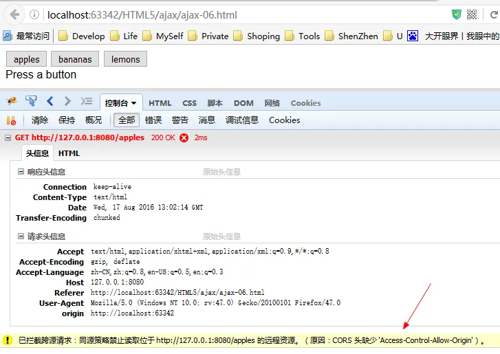这个例子中的脚本扩展了用户所按按钮的内容,把它附加到 http://127.0.0.1:8080/ 上,然后尝试生成Ajax请求(如 http://127.0.0.1:8080/apples)。这里会从 http://localhost:63342/HTML5/ajax/ajax-06.html 载入此文档,这就意味着脚本正在试图生成一个跨源请求。