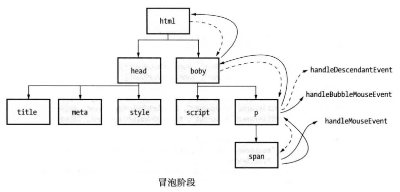 当某个事件被触发时,浏览器会找出事件涉及的元素,它被称为该事件的目标。浏览器会找出body元素和目标之间的所有元素并分别检查它们,看看它们是否带有事件处理器且要求获得其后代元素触发事件的通知。浏览器会先触发这些事件处理器,然后才会轮到目标自身的处理器。