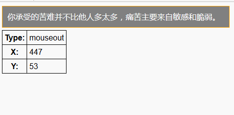 <!DOCTYPE html> <html lang="en"> <head> <meta charset="UTF-8"> <title>使用MouseEvent对象响应鼠标事情</title> <style> p {background: gray;color: white;padding: 10px;margin: 5px;border: thin solid orange;} table {margin: 5px;border-collapse: collapse;} th,td {padding: 4px;} </style> </head> <body> <p id="block1"> 你承受的苦难并不比他人多太多,痛苦主要来自敏感和脆弱。 </p > <table border="1"> <tr><th>Type:</th><td id="eType"></td></tr> <tr><th>X:</th><td id="eX"></td></tr> <tr><th>Y:</th><td id="eY"></td></tr> </table> <script type="application/javascript"> function $(id){ return document.getElementById(id); } function handleMouseEvent(e){ if (e.eventPhase == Event.AT_TARGET){ $("eType").innerHTML = e.type; $("eX").innerHTML = e.clientX; $("eY").innerHTML = e.clientY; if(e.type == "mousemove"){ e.target.style.background = 'white'; e.target.style.color = 'blue'; }else { e.target.style.removeProperty('background'); e.target.style.removeProperty('color'); } } } $("block1").addEventListener("mouseout",handleMouseEvent,false); $("block1").addEventListener("mousemove",handleMouseEvent,false); </script> </body> </html>