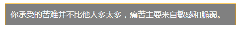 <!DOCTYPE html> <html lang="en"> <head> <meta charset="UTF-8"> <title>用内联JavaScript处理事件</title> <style> p {background: gray;color:white;padding: 10px;margin: 5px;border: thin solid orange;} </style> </head> <body> <p onmouseover="this.style.background='white';this.style.color = 'black'"> 你承受的苦难并不比他人多太多,痛苦主要来自敏感和脆弱。 </p> </body> </html>