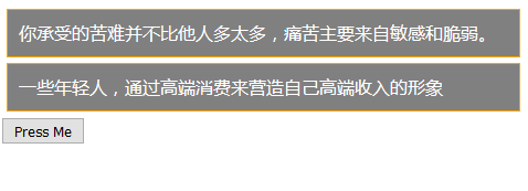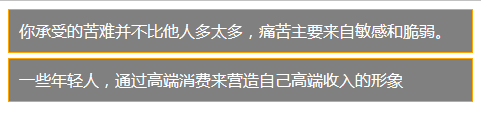 <!DOCTYPE html> <html lang="en"> <head> <meta charset="UTF-8"> <title>用函数来处理事件</title> <style> p {background: gray;color:white;padding: 10px;margin: 5px;border: thin solid orange;} </style> </head> <body> <p onmouseover="handleMouseOver(this)" onmouseout="handleMouseOut(this)"> 你承受的苦难并不比他人多太多,痛苦主要来自敏感和脆弱。 </p > <p onmouseover="handleMouseOver(this)" onmouseout="handleMouseOut(this)"> 一些年轻人,通过高端消费来营造自己高端收入的形象 </p> <script> function handleMouseOver(elem){ elem.style.background='white'; elem.style.color = 'black'; } function handleMouseOut(elem){ elem.style.removeProperty('color'); elem.style.removeProperty('background'); } </script> </body> </html>