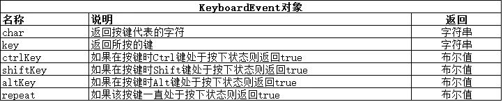 keyboardEvent对象代表了这些事件,相对于Event对象的核心功能,它还增加了下表里展示的属性。