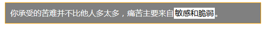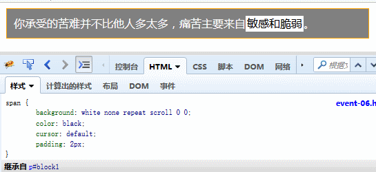 <!DOCTYPE html> <html lang="en"> <head> <meta charset="UTF-8"> <title>用内联JavaScript处理事件</title> <style> p {background: gray;color:white;padding: 10px;margin: 5px;border: thin solid orange;} </style> </head> <body> <p onmouseover="this.style.background='white';this.style.color = 'black';" onmouseout="this.style.removeProperty('color');this.style.removeProperty('background');"> 你承受的苦难并不比他人多太多,痛苦主要来自敏感和脆弱。 </p> </body> </html>