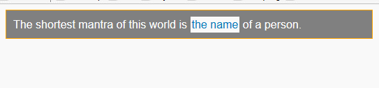 <!DOCTYPE html> <html lang="en"> <head> <meta charset="UTF-8"> <title>事件冒泡</title> <style type="text/css"> p {background: gray;color: white;padding: 10px;margin: 5px;border: thin solid orange;} span {background: white;color: #017CB9;padding: 2px;cursor: default;} </style> </head> <body> <p id="block1"> The shortest mantra of this world is <span id="point">the name</span> of a person. </p > <script type="application/javascript"> var point = document.getElementById("point"); var textBlock = document.getElementById("block1"); point.addEventListener("mouseover",handleMouseEvent); point.addEventListener("mouseout",handleMouseEvent); function handleMouseEvent(e){ if(e.type == "mouseover"){ e.target.style.background='black'; e.target.style.color = 'white'; }else if(e.type == "mouseout"){ e.target.style.removeProperty('background'); e.target.style.removeProperty('color'); } } textBlock.addEventListener("mouseover",handleDescendantEvent,true); textBlock.addEventListener("mouseout",handleDescendantEvent,true); function handleDescendantEvent(e){ if(e.type == "mouseover" && e.eventPhase == Event.CAPTURING_PHASE){ e.target.style.border = "thick solid red"; e.currentTarget.style.border = "thick double blue"; }else if(e.type == "mouseout" && e.eventPhase == Event.CAPTURING_PHASE){ e.target.style.removeProperty("border"); e.currentTarget.style.removeProperty("border"); } } textBlock.addEventListener("mouseover",handleBubbleMouseEvent,false); textBlock.addEventListener("mouseout",handleBubbleMouseEvent,false); function handleBubbleMouseEvent(e){ if(e.type == "mouseover" && e.eventPhase == Event.BUBBLING_PHASE){ e.target.style.textTransform = "uppercase"; }else if(e.type == "mouseout" && e.eventPhase == Event.BUBBLING_PHASE){ e.target.style.textTransform = "none"; } } </script> </body> </html>