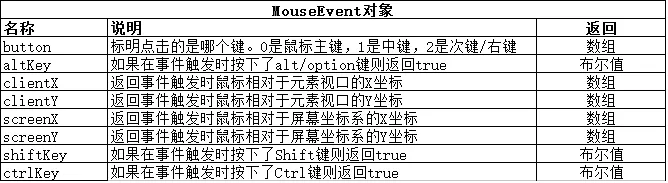 前面已经有介绍过mouseover和mouseout事件了,下表展示了鼠标相关事件的完整集合。