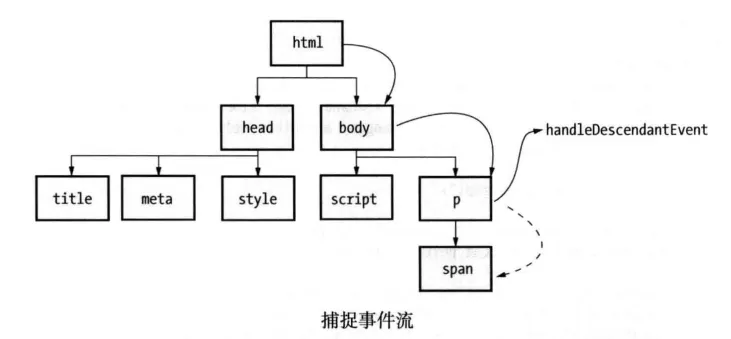 这个额外的参数告诉浏览器让p元素在捕捉阶段接收后代元素的事件。当mouseover事件被触发时,浏览器会从HTML文档的跟节点起步,一路沿着DOM向目标(也就是触发事件的元素)前进。对层级里的每一个元素,浏览器都会检查它是否对捕捉到的事件感兴趣。可以从下图看到示例文档的顺序。