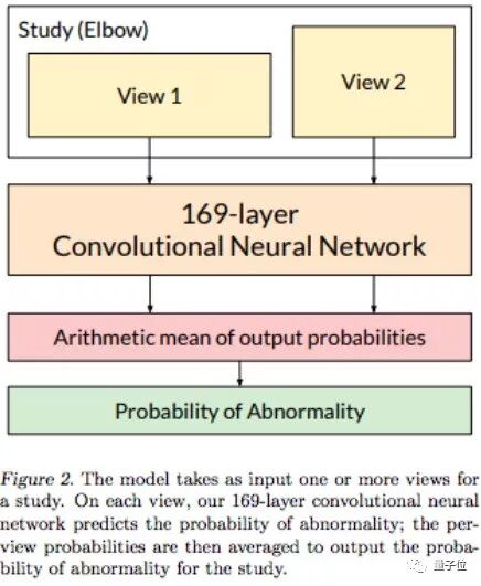 该神经网络含有169层。当输入多角度的上肢X光片时,模型就可以预测出异常的概率。