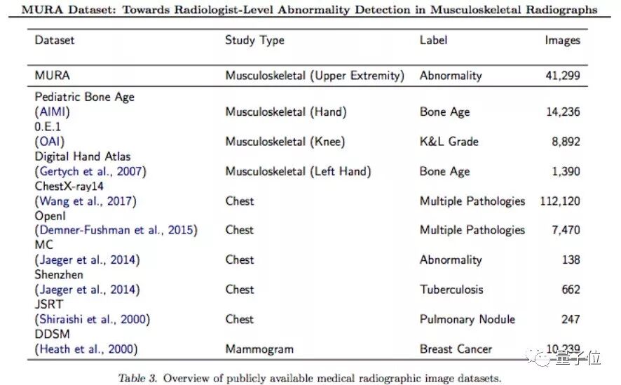 △ MURA目前是最大的开源医学放射图像数据集。第二大的数据集是Pediatric Bone,含有14236张图,可以根据手的X光片测出人的骨龄;0.E.1是关于膝关节的数据集,可用来查出膝关节炎。