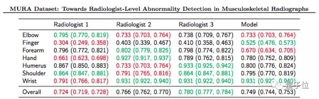 △ 图中绿色字体表示表现最优,红色字体代表表现最差。模型对手指、手腕的诊断效果要比三位放射医生的效果都要好。手肘和前臂的诊断结果比人类都差。