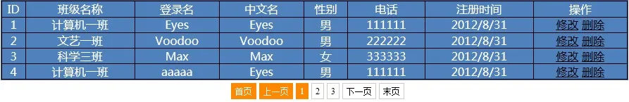 public partial class Default : System.Web.UI.Page { protected StringBuilder sbTableContent = new StringBuilder(); protected string PageHtml = string.Empty; protected int nextPage = 1; protected int nowPage = 1; BLL.StudentManager studentManager = new BLL.StudentManager(); protected void Page_Load(object sender, EventArgs e) { //加载 //加载之前先判断是否登陆 if (new WebHelper().IsLogin()) { LoadList(); } else { Response.Redirect("AjaxLogin.aspx"); } } private void LoadList() { int initRowCount=0; int initPageCount=0; MyPage page = new MyPage(); page.TryParseCurrentPageIndex(Request.QueryString["page"]); List<Model.Students> listStudents = studentManager.QueryListByPageIndexPro(page.CurrentPageIndex,page.PageSize , out initRowCount, out initPageCount); page.PageCount = initPageCount; page.TotalCount = initRowCount; page.UrlFormat = "Default.aspx?page={n}"; PageHtml = page.RenderToHTML(); int index = (page.CurrentPageIndex - 1) * page.PageSize + 1; if (listStudents!=null) { foreach (Model.Students model in listStudents) { sbTableContent.Append("<tr><td>" + index.ToString()+ "</td>"); sbTableContent.Append("<td>"+model.SClasses.CName+"</td>"); sbTableContent.Append("<td>"+model.SLoginName+"</td>"); sbTableContent.Append("<td>"+model.SCnName+"</td>"); sbTableContent.Append("<td>"+(model.SGender.Value?"男":"女")+"</td>"); sbTableContent.Append("<td>"+model.STel+"</td>"); sbTableContent.Append("<td>"+model.SAddtime.Value.ToShortDateString()+"</td>"); sbTableContent.Append("<td><a href='Modify.aspx?id="+model.SID.ToString()+"'>修改</a> <a href='javascript:doDel("+model.SID.ToString()+")'>删除</a>"); index++; } } } }