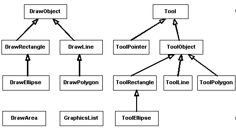 - DrawArea – 用来填充主程序在窗体上可用区域的用户控件。包括GraphicsList 类的实例。绘制图形对象, 处理鼠标输入,把(鼠标)命令传给GraphicsList。