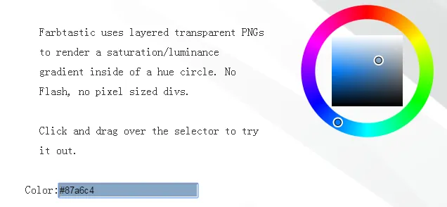 Farbtastic是一个jQuery插件,可以将一个或多个颜色选择器小部件添加到一个页面通过JavaScript。,当选择一个颜色,每个小部件都会讲现有的元素(如一个文本字段)和将更新元素的值相联系。