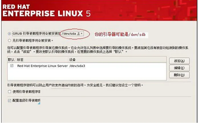 9、在安装的过程中请注意:如果Grub的引导器安装在/dev/sdb上,那么,在拔出u盘之后,就无法引导系统。按下面的来操作:改变grub引导顺序,把”配置高级引导装载程序选项”选上。按下一步。