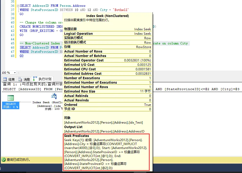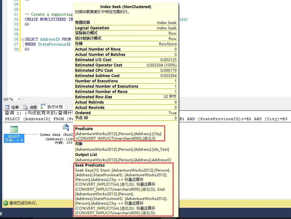 这个情况下,如你在执行计划里所见,SQL在StateProvinceID列上对查询进行非聚集索引查找操作,对于City列要计算剩余谓语的值: