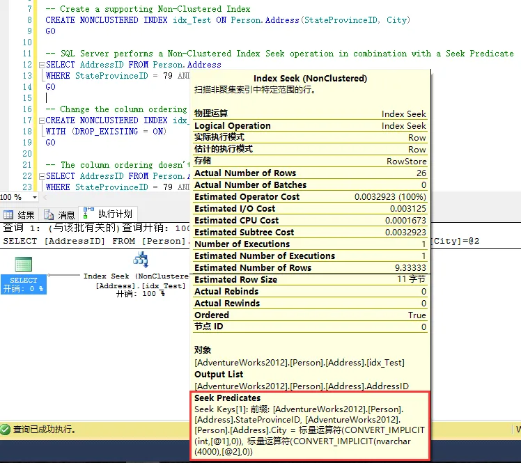 -- Create a supporting Non-Clustered Index CREATE NONCLUSTERED INDEX idx_Test ON Person.Address(StateProvinceID, City) GO -- SQL Server performs a Non-Clustered Index Seek operation in combination with a Seek Predicate SELECT AddressID FROM Person.Address WHERE StateProvinceID = 79 AND City = 'Bothell' GO -- Change the column ordering CREATE NONCLUSTERED INDEX idx_Test ON Person.Address(City, StateProvinceID) WITH (DROP_EXISTING = ON) GO -- The column ordering doesn't matter in the Non-Clustered Index SELECT AddressID FROM Person.Address WHERE StateProvinceID = 79 AND City = 'Bothell' GO