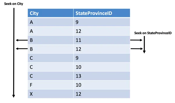 如你所见,现在的数据按City预先排,在每个City组里,你会有在StateProvinceID列的排序。因此你可以直接获得逻辑请求的数据——不用进一步剩余谓语(Residual Predicate)的值计算就可以返回值。