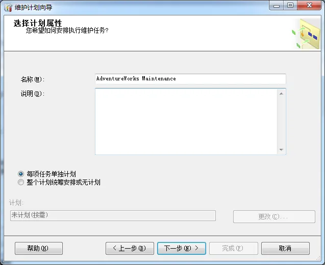 点击下一步,给维护计划取个名字。例如,你打算在AdventureWorks数据库上执行维护任务,因此你可以命名为AdventureWorks Maintenance。键入说明,选择"每项任务单独计划"来查看一个复杂的代理作业调度。如插图2所示: