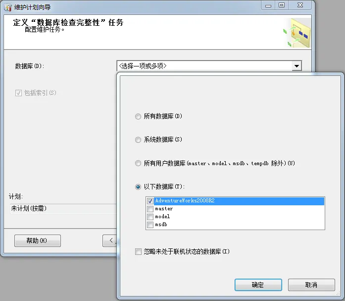 点击下一步,选择执行任务的顺序。继续下一步,你会看到定义"数据库检查完整性"面板,从数据库列表中选择AdventureWorks,如图插图4所示。注意,你可以选择多个数据库,所有数据库,系统数据库,所有用户数据库。你也可以勾选"忽略未处于联机状态的数据库",避免你选择维护所有数据库时出错。