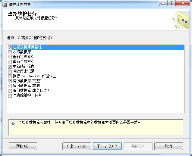 点击下一步,然后选择你要执行的维护任务,选择"检查数据库完整性"、"更新统计信息"、"备份数据库(完整)",如插图3所示: