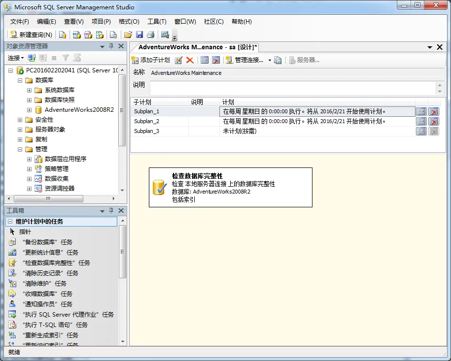 维护计划是一个非常漂亮的图形界面来帮助你维护SQL Server数据库的常见任务。使用维护计划是一个很好的捷径,而不是手动创建正确的T-SQL或PowerShell脚本来执行这些日常维护任务。这些任务包括:
