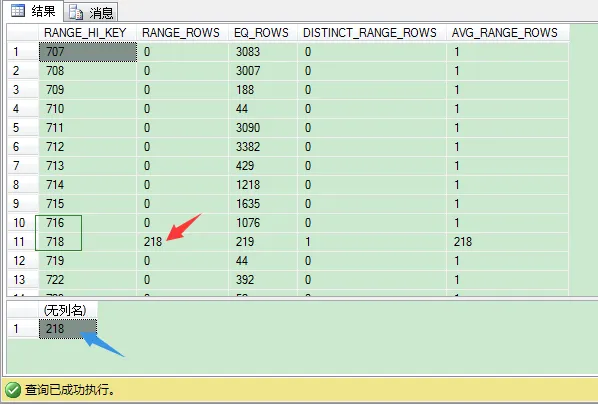 RANGE_ROWS列表示在那桶范围内的记录数,但不等于RANGE_HI_KEY值。第一条记录的0值标识,在整个表里没有一条记录productid值是小于707的。我们来看第11条记录,它的RANGE_HI_KEY值是718,RANGE_ROWS 列值是218。这就是说,有218条记录的productid是大于716(上一条RANGE_HI_KEY值)且小于718的。我们可以去验证下。