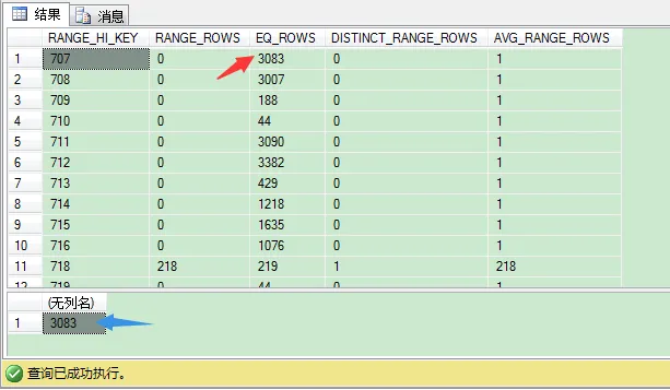 EQ_ROWS列表示表里与RANGE_HI_KEY值匹配的记录数。对于第一条记录,EQ_ROWS值为3083表示表里productid值为707的记录有3083条。我们可以验证下。