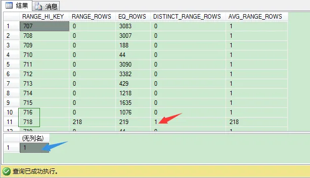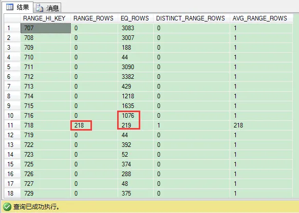 DISTINCT_RANGE_ROWS 列表示在2个RANGE_HI_KEY值之间的不同记录数(不同productid值)。我们来看第11条的RANGE_HI_KEY值是718,DISTINCT_RANGE_ROWS列值为1,这就是说productid值大于716(上一个RANGE_HI_KEY值)且小于718只有1条不同记录。我们可以验证下。