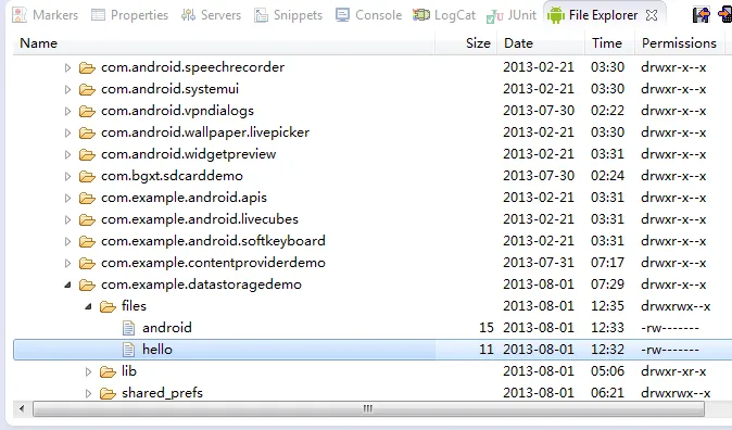 使用内部存储的方式进行数据持久化,文件的地址将保存在/data/data/<package_name>/files/路径下,上面创建了三个文件,最后删掉了一个,如果是使用的模拟器,可以直接在File Explorer中查看: