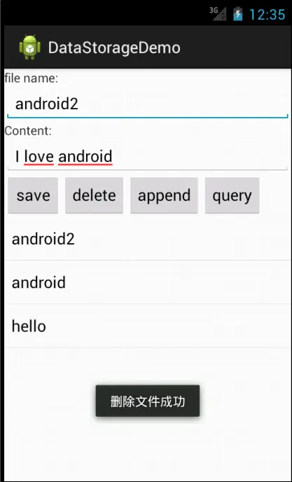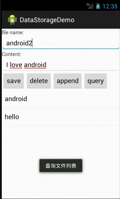 讲了这么多,下面通过一个简单的Demo来演示一下上面提到的内容。在这个Demo中,指定文件名和内容,既可创建文件,并且可以对其内容进行追加、修改、删除、查询等操作。
