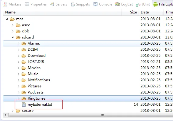 而如果使用SdCard存储文件的话,存放的路径在Sdcard的根目录下,如果使用模拟器运行程序的话,创建的文件在/mnt/sdcard/目录下: