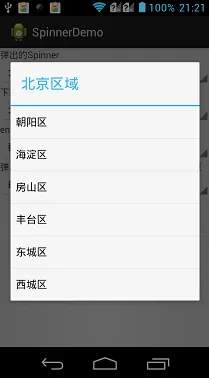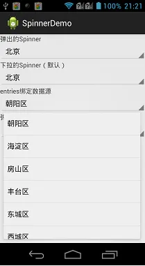 1 <?xml version="1.0" encoding="utf-8"?> 2 <resources> 3 <string name="app_name">SpinnerDemo</string> 4 <string name="action_settings">Settings</string> 5 <string name="hello_world">Hello world!</string> 6 <string name="beij_prompt">北京区域</string> 7 <string-array name="beijing"> 8 <item>朝阳区</item> 9 <item>海淀区</item> 10 <item>房山区</item> 11 <item>丰台区</item> 12 <item>东城区</item> 13 <item>西城区</item> 14 </string-array> 15 </resources>