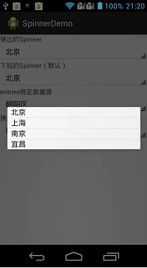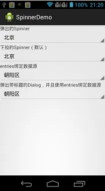 1 <?xml version="1.0" encoding="utf-8"?> 2 <LinearLayout xmlns:android="http://schemas.android.com/apk/res/android" 3 android:layout_width="match_parent" 4 android:layout_height="match_parent" 5 android:orientation="vertical" > 6 7 <TextView 8 android:layout_width="wrap_content" 9 android:layout_height="wrap_content" 10 android:text="弹出的Spinner" /> 11 12 <Spinner 13 android:id="@+id/spinnerBase" 14 android:layout_width="match_parent" 15 android:layout_height="wrap_content" 16 android:spinnerMode="dialog" /> 17 18 <TextView 19 android:layout_width="wrap_content" 20 android:layout_height="wrap_content" 21 android:text="下拉的Spinner(默认)" /> 22 23 <Spinner 24 android:id="@+id/spinnerBase1" 25 android:layout_width="match_parent" 26 android:layout_height="wrap_content" 27 android:spinnerMode="dropdown" /> 28 29 <TextView 30 android:layout_width="wrap_content" 31 android:layout_height="wrap_content" 32 android:text="entries绑定数据源" /> 33 34 <Spinner 35 android:id="@+id/spinnerBase2" 36 android:layout_width="match_parent" 37 android:layout_height="wrap_content" 38 android:entries="@array/beijing" /> 39 40 <TextView 41 android:layout_width="wrap_content" 42 android:layout_height="wrap_content" 43 android:text="弹出带标题的Dialog,并且使用entries绑定数据源" /> 44 45 <Spinner 46 android:id="@+id/spinnerBase3" 47 android:layout_width="match_parent" 48 android:layout_height="wrap_content" 49 android:entries="@array/beijing" 50 android:prompt="@string/beij_prompt" 51 android:spinnerMode="dialog" /> 52 53 </LinearLayout>