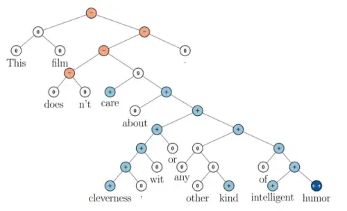 在上图中,蓝色表示正面评价,红色表示负面评价。每个节点是一个向量,这个向量表达了以它为根的子树的情感评价。比如"intelligent humor"是正面评价,而"care about cleverness wit or any other kind of intelligent humor"是中性评价。我们可以看到,模型能够正确的处理doesn't的含义,将正面评价转变为负面评价。