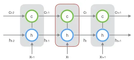 上图仅仅是一个示意图,我们可以看出,在t时刻,LSTM的输入有三个:当前时刻网络的输入值、上一时刻LSTM的输出值、以及上一时刻的单元状态;LSTM的输出有两个:当前时刻LSTM输出值、和当前时刻的单元状态。注意、、都是向量。