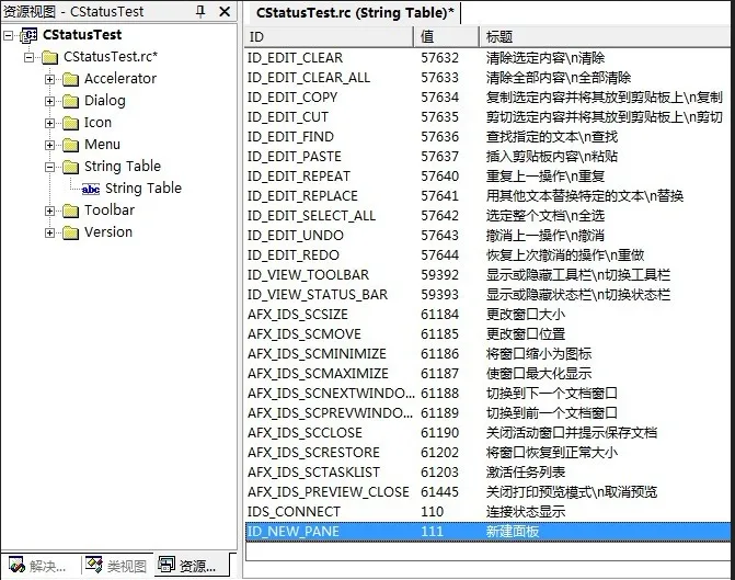1). 切换到资源视图,打开String Table,在里面新建一项,ID、值和标题随便取。如ID = ID_NEW_PANE、值=111、标题 = 新建面板。