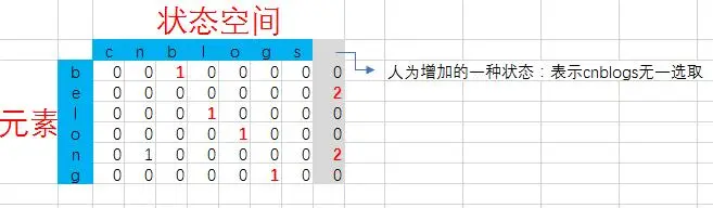 for i in range(len(b)+1): # 遍历 状态空间:0~len(b)-1,技巧:人为增加一种状态len(b),表示改行没有元素选取