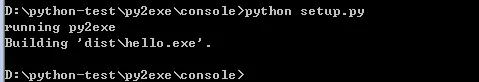 # setup.py from distutils.core import setup import py2exe import sys #this allows to run it with a simple double click. sys.argv.append('py2exe') py2exe_options = { "compressed": 1, "optimize": 2, "ascii": 0, "bundle_files": 1, # 其中bundle_files有效值为: # 3 (默认)不打包。 # 2 打包,但不打包Python解释器。 # 1 打包,包括Python解释器。 setup( name = 'console demo', version = '1.0', console = ['hello.py',], # console 命令行执行程序 # windows 窗口执行程序 zipfile = None, options = {'py2exe': py2exe_options} )