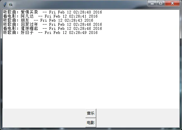 class Application(tk.Tk): def __init__(self): super().__init__() self.createUI() # 生成界面 def createUI(self): self.text = tk.Text(self) self.text.pack() tk.Button(self, text='音乐', command=lambda :self.thread_it(self.music, songs)).pack(expand=True, side=tk.RIGHT) # 注意lambda语句的作用! tk.Button(self, text='电影', command=lambda :self.thread_it(self.movie, films)).pack(expand=True, side=tk.LEFT) # 逻辑:听音乐 def music(self, songs): for x in songs: self.text.insert(tk.END, "听歌曲:%s \t-- %s\n" %(x, time.ctime())) print("听歌曲:%s \t-- %s" %(x, time.ctime())) time.sleep(3) # 逻辑:看电影 def movie(self, films): for x in films: self.text.insert(tk.END, "看电影:%s \t-- %s\n" %(x, time.ctime())) print("看电影:%s \t-- %s" %(x, time.ctime())) time.sleep(5) # 打包进线程(耗时的操作) @staticmethod def thread_it(func, *args): t = threading.Thread(target=func, args=args) t.setDaemon(True) # 守护--就算主界面关闭,线程也会留守后台运行(不对!) t.start() # 启动 # t.join() # 阻塞--会卡死界面! app = Application() app.mainloop()