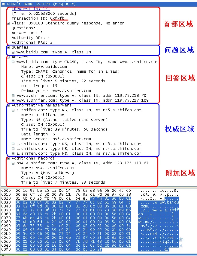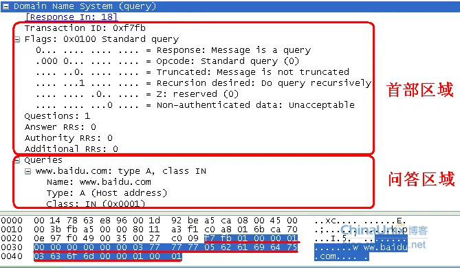 以www.baidu.com为例,用Wireshark俘获分组,结合2.1的理论内容,很容易看明白的,DNS请求报文如下:
