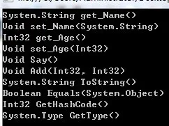 static void Main(string[] args) { Type t = typeof(Person); MethodInfo[] MethodInfoList = t.GetMethods(); foreach (MethodInfo info in MethodInfoList) { Console.WriteLine(info); } Console.ReadKey(); } }