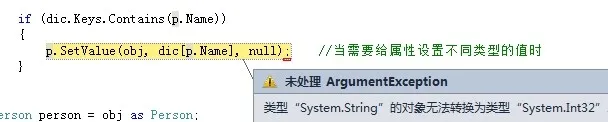 static void Main(string[] args) { Type type = typeof(Person); //注意要输入全部路径,包括命名空间 object obj = Activator.CreateInstance(type); //假设这是存在于XML的数据 Dictionary<string, string> dic = new Dictionary<string, string>(); dic.Add("Id", "1"); dic.Add("Name", "神灵武士"); dic.Add("Birthday", "2001-01-01"); PropertyInfo[] ProArr = type.GetProperties(); foreach (PropertyInfo p in ProArr) { if (dic.Keys.Contains(p.Name)) { p.SetValue(obj, Convert.ChangeType(dic[p.Name], p.PropertyType), null); //当需要给属性设置不同类型的值时 } } Person person = obj as Person; Console.WriteLine(person.Birthday); Console.ReadKey(); } } //有三种不同类型的属性 public class Person { public int Id { get; set; } public string Name { get; set;} public DateTime Birthday { get; set; } } }