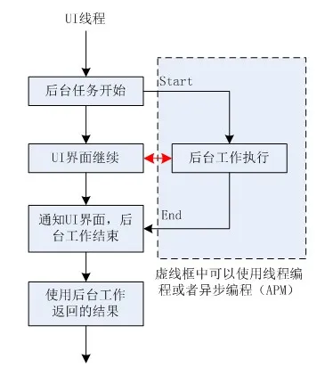 至于怎么通知UI界面,后台工作结束了,你可以在OnAsync中完成这个功能。