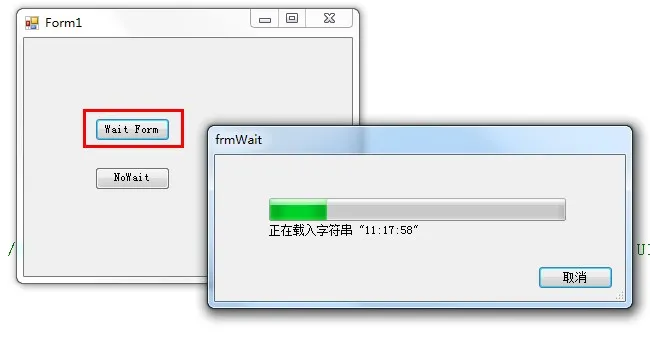 以上是两种情况,以及对应的结构图,我做了一个Demo,包含两种等待窗体,一种即为“模式等待窗体”,另一种为“非模式等待窗体”。源码在文章结束后有下载地址。先来分别看一下两者的代码: