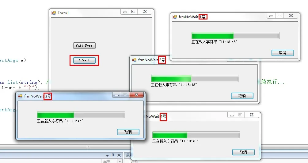 如上代码所示,后台工作开始后,弹出一个非模式对话框,UI界面可以继续操作,也就是说,你可以出现多个frmNoWait窗体,使用很简单,如下: