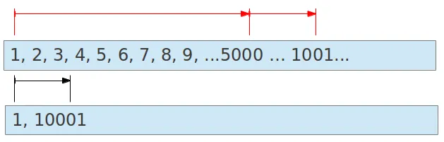 如果对这两个做合并操作, 最后的交集结果只有 [1, 10001] 2个元素, 但是却要做10001次移动和比较操作, 所以肯定有什么办法来优化这一点. 可能你已经想到了, 我们做了这么多无用比较, 是因为我们每次指针向前移动的步子太小了点, 如果我们在每次比较后向前多移动一点, 可以忽略很比无用的操作. 这就是跳表的思想.