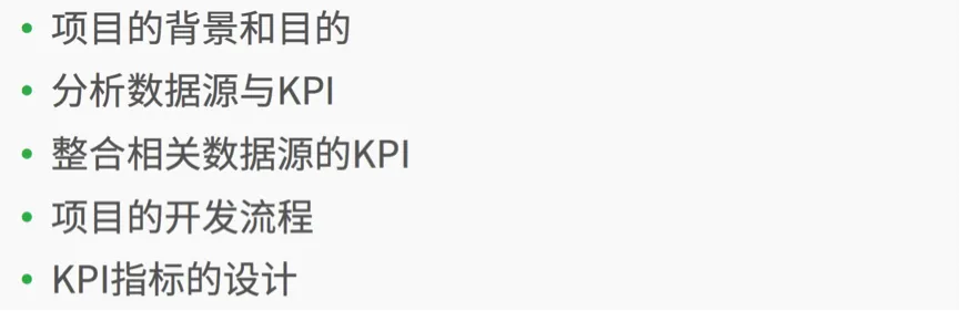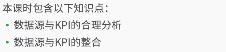 我准备为大家介绍 如何有效的去分析各类KPI和数据源,让大家掌握将数据源和各个KPI合理的关联起来。下面我们来看看本课时需要学习的知识点。